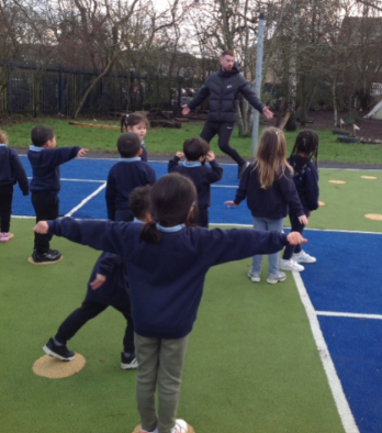 Nursery class have been enjoying PE lessons with Mr Reilly. The children have been moving in a variety of ways such as jumping, hopping, skipping and running