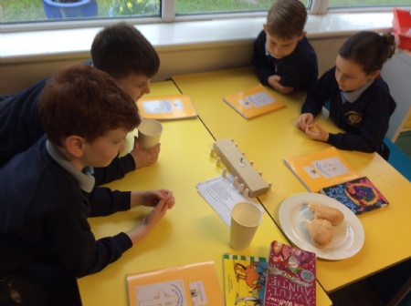 In RE, the children reflected on the story of the Last Supper, its symbols and actions, and made links to other known bible stories. They enjoyed re-enacting the Last Supper story using the props provided.