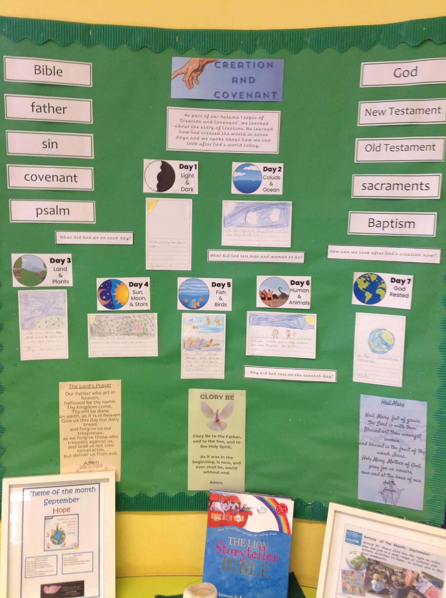 This week, we learned about the story of Creation in RE. We created a display to show what God created on each day.