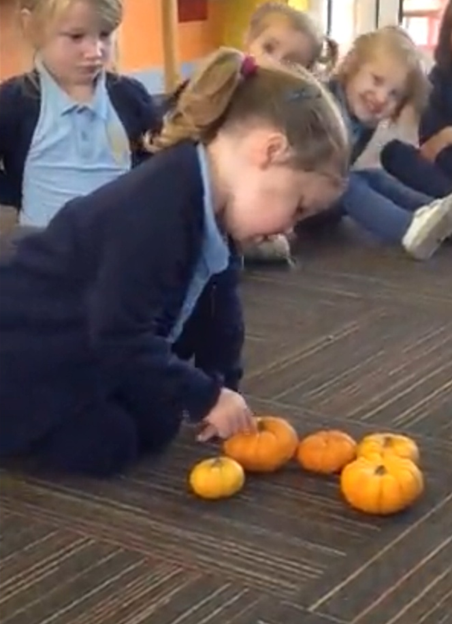 Thank you for sending in your pumpkins and squash. We have fun comparing their size, counting them, rearranging them and counting them again.